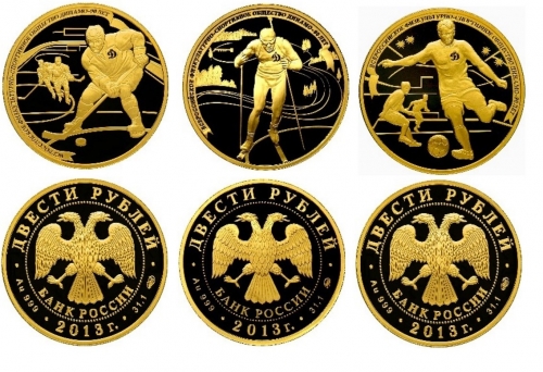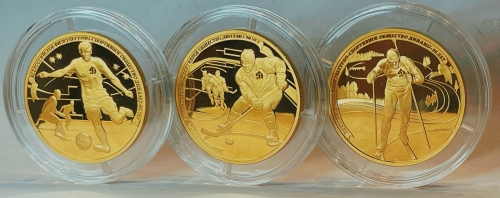 Комплект золотых монет "90 лет Динамо. Биатлон, Хоккей, Футбол" 200 рублей 2013 г.