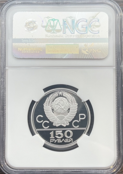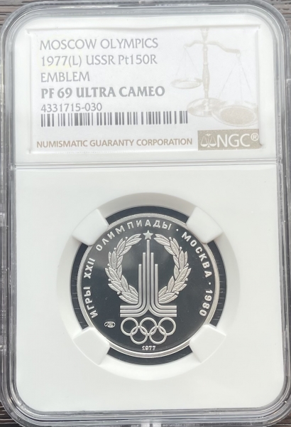 Платиновая монета 150 рублей "Эмблема Олимпийских игр" 1977г. ЛМД в слабе NGC PROOF 69 ULTRA CAMEO