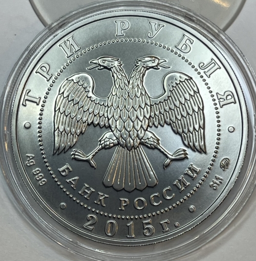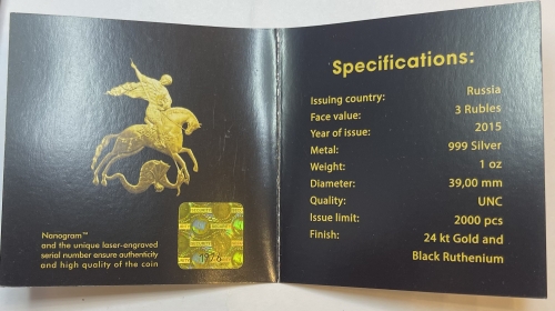 Серебряная монета 3 рубля "Георгий Победоносец", 2015 г., в спец исполнении, Ag 999, 31,1г.,ММД