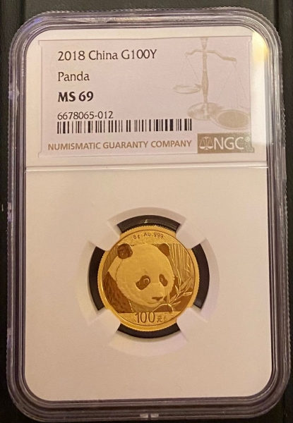 Золотая монета 100 юаней "Панда" 2018г., 8 г., 999 проба в слабе NGC MS 69
