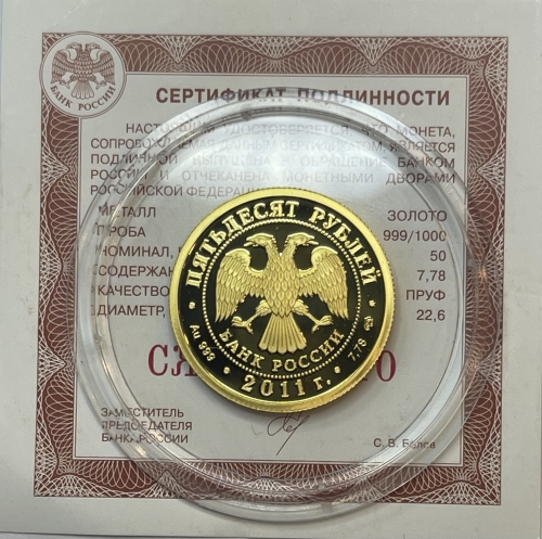 Золотая монета 50 рублей "200-летие внутренних войск МВД России" 2011г., 7,78 г., Au 999, ПРУФ, СПМД