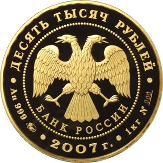 в центре - эмблема Банка России (двуглавый орел с опущенными крыльями, под ним - надпись полукругом "БАНК РОССИИ"), обрамленная кругом из точек и надписями, вверху - номинал: "ДЕСЯТЬ ТЫСЯЧ РУБЛЕЙ", внизу: слева - обозначения драгоценного металла, пробы сплава и товарный знак монетного двора, в центре - год выпуска "2007 г.", справа – содержание химически чистого металла и порядковый номер монеты №s__.